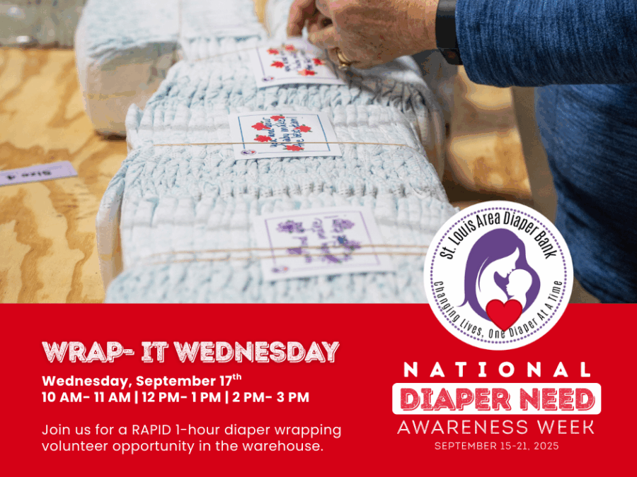 Join us during National Diaper Need Awareness Week, September 15-21, 2025, a time to bring awareness and address the issues of diaper need plaguing much of our community. Join us in our work to make diapers accessible for families across St. Louis.